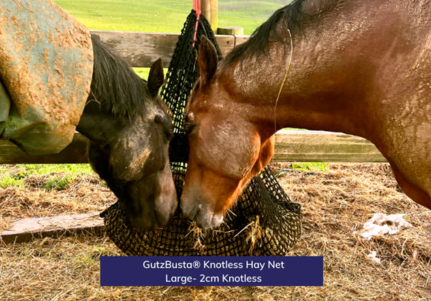 Our Large GutzBusta® Knotless Hay Nets are fantastic for stables, yards, and paddock. A great day to 2+ day net (depending on hay used, and hole size). Opening on the long side they are very easy to load a full small bale of hay into.