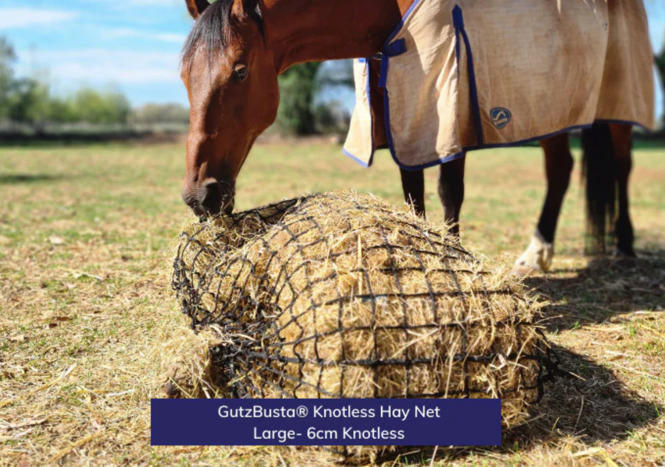 A GutzBusta® Round Bale Hay Net decreases wastage by up to 46%. In our situation, a 4x4 round bale of pasture hay can last 3 to 4 horses for 7 to 15 days with a 4cm net, depending on how cold the weather is. This rate was for Winter, however, in Summer, we found that a 4x4 lasted these horses nearly 3 months due to being low sugar/palatability