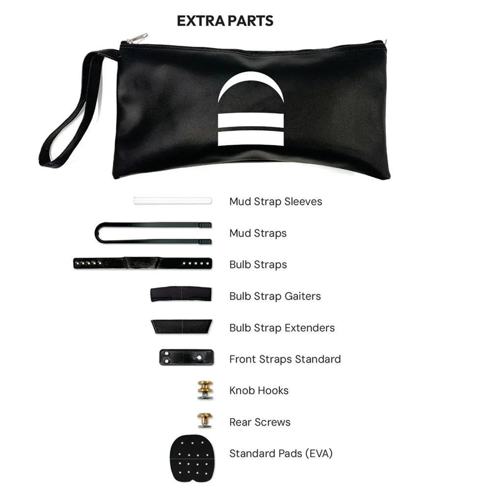 The Accessory Bag contains multiple spare parts, and a full list is below. These include additional sizes of mud straps and bulb strap extenders to lift the bulb strap higher on the bulbs to accommodate high heels.
